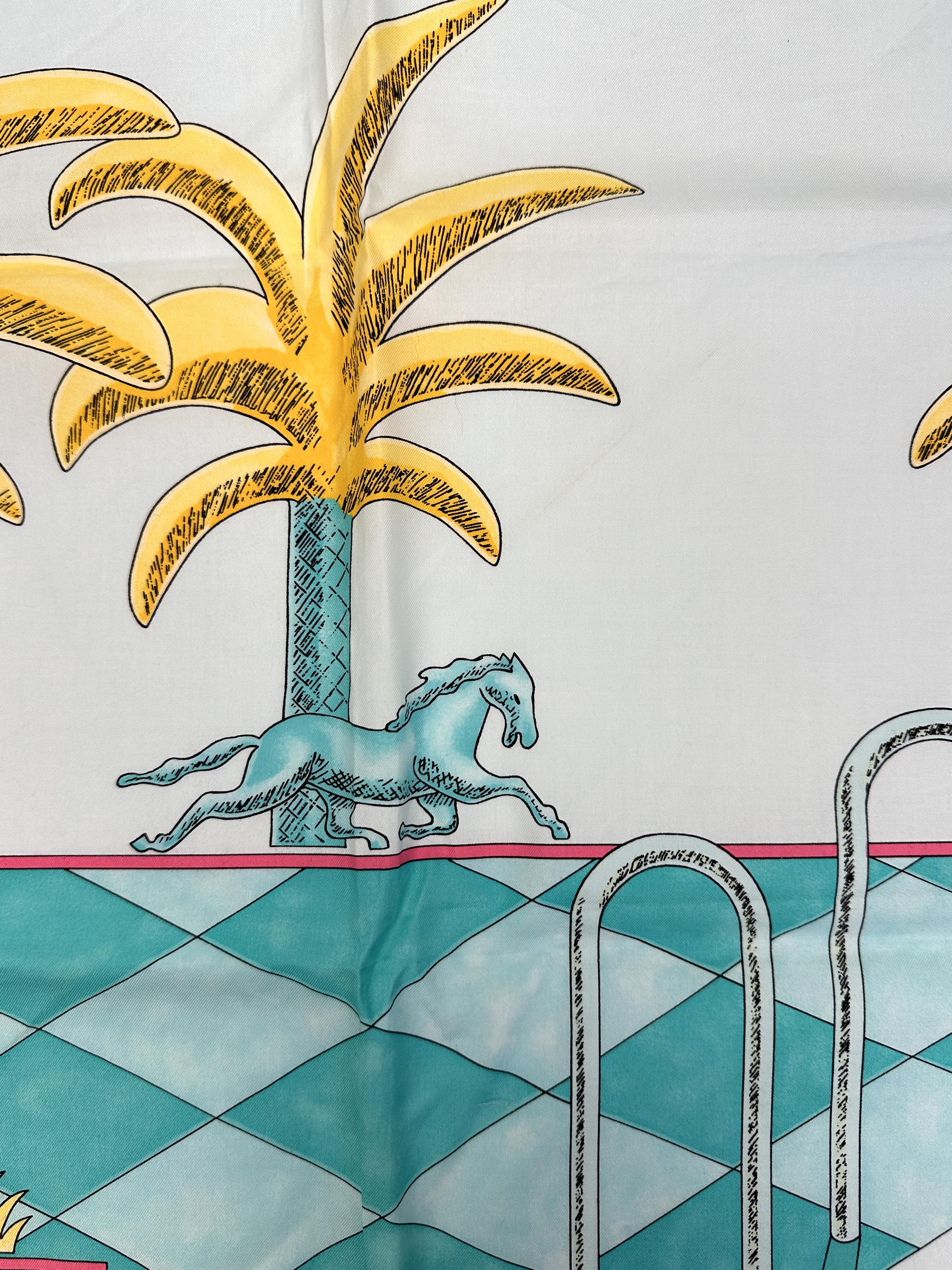 Why I Love This Pattern: I've been obsessed with this pattern for years, and with so little information available, I've managed to piece together a few key details about it, while I was on the hunt for my own. And yes, I also have one in my own collection! 1. It was originally released as part of a seasonal series, with a similar design created for each of the four seasons. 2. It was only issued once, and exclusively in cotton. 3. The chic summer estate featured might be located in Monaco! Joachim Metz also created a limited-edition Monaco-themed scarf in 2008, where a similar summer estate with checker tiles and horse appear in the design.